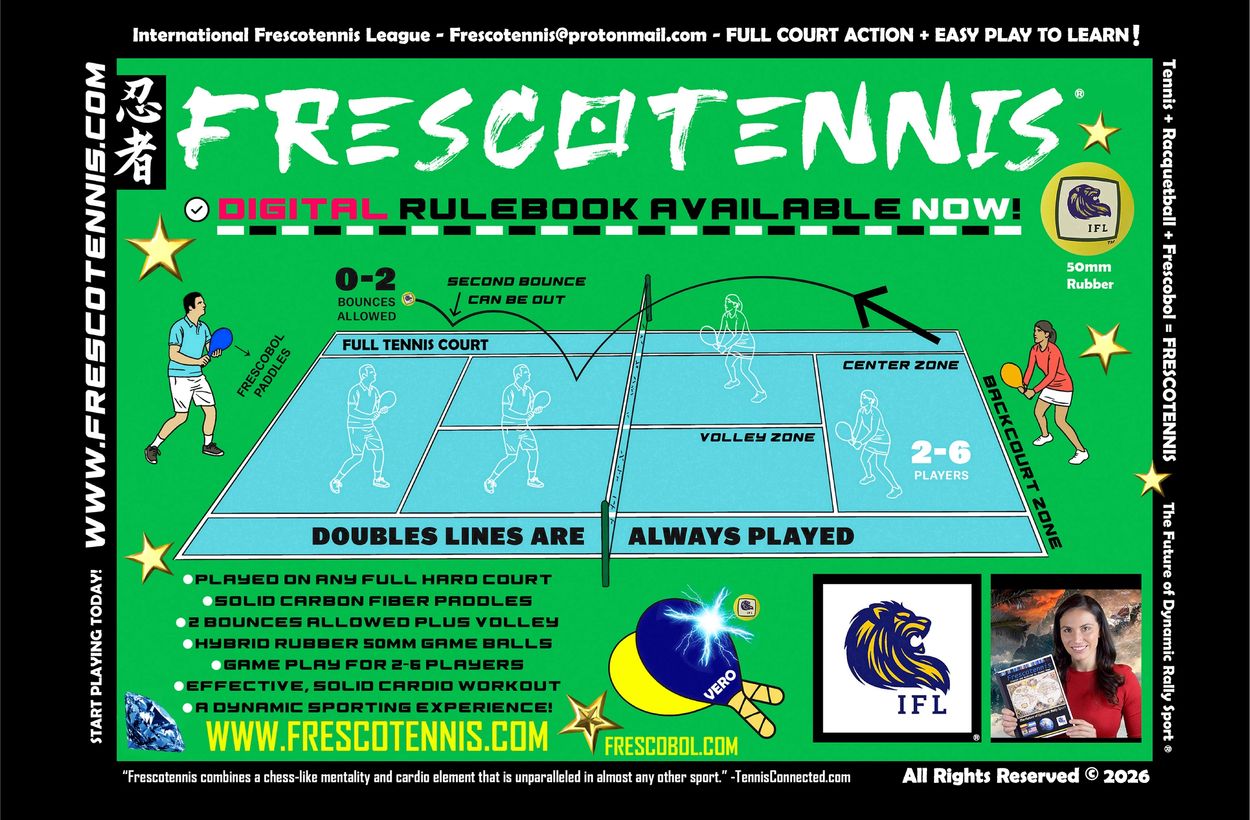 Frescotennis was created for a multitude of reasons; an exciting, effective full-court cardiovascular workout where all ages/genders can compete evenly with the infusion of strategically balanced rules. A 2-6 player dynamic, substantive workout that has less long-term body impact than tennis. WARNING: ADDICTIVE!
